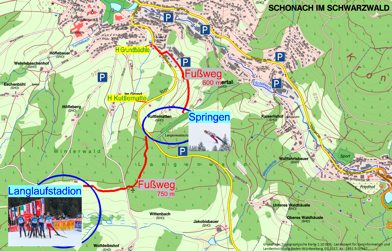 Die Sportstätten sind von den Haltestellen Grundbächle und Kuttlematte zu Fuß in wenigen Minuten zu erreichen.
